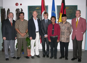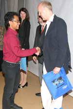 Dr. Helmut Buchholt, Kepala DAAD Jakarta, mengucapkan selamat kepada Abdullah Malik Ibrahim, lulusan Studienkolleg Indonesia, penerima beasiswa DAAD (tanggal 11 Juni 2010 di DIS)